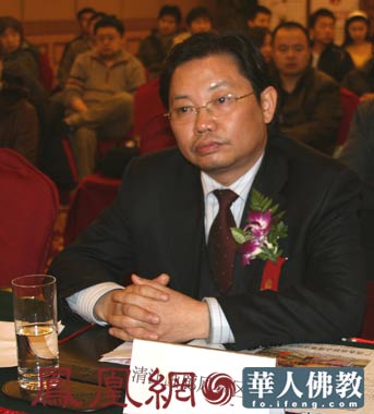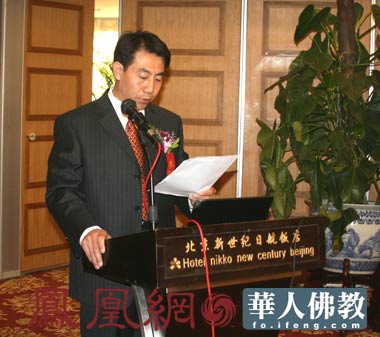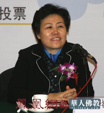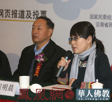 凤凰网华人佛教频道主编崔明晨在颁奖仪式上代表评委回答记者提问