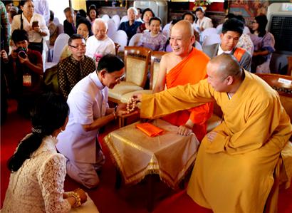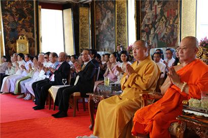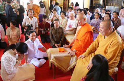 印顺大和尚非常高兴能有机会与各位新老朋友见面。泰国两任前总理英拉和颂猜顶礼大和尚,特别是前总理英拉见到大和尚,顶礼叩拜,激动万分。她向大和尚说,中泰一家亲,我也是中国人的后裔。我在当总理时曾经清楚记得给你发过五次贺电,今天又能在金山寺见到师父,真是福报功德。印顺大和尚向英拉表示感谢,强调佛教是中泰两国人民的黄金纽带,今后我们要将中泰两国的佛教发扬光大,共同为维护世界和平与南海地区的稳定作出贡献。大和尚的话受到了与会者的欢迎,掌声雷动。