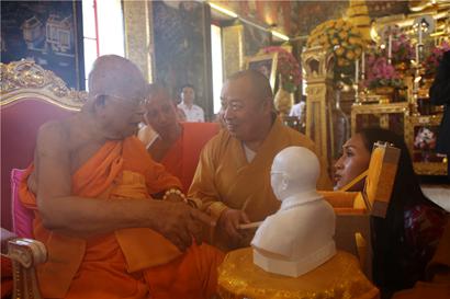 泰国副僧王帕·蓬玛西提长老是中国佛教界的老朋友,曾经多次来中国参访交流,并在深圳弘法寺接本焕长老法脉,取法名印和。印顺大和尚与印和师兄相互合掌,老朋友相聚,共叙法谊。印顺大和尚率全体本焕学院执事班学员法师出席帕·蓬玛西提长老升座大典。这些法师从尼泊尔中华寺直接奔赴金山寺,他们在赈灾中的表现获得中外嘉宾的一致赞赏。大和尚向长老表示祝贺,见证双方长期以来结下的深厚友谊。印顺大和尚赠送帕·蓬玛西提长老手书“方丈”牌匾,以示隆重。该牌匾将作为帕·蓬玛西提长老方丈室的匾额,两位大德惺惺相惜,友谊万古长青。