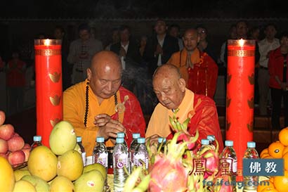 印定长老(右)和明澈大和尚(左)拈香礼佛(图片来源:凤凰佛教 摄影:顿博)