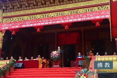 接着,三大语系佛教法师依次举行诵经礼佛祈福仪式,崇化法师带领汉传佛教高僧诵经祈福;关加益西活佛带领藏传佛教僧众诵经祈福;祜巴龙庄勐长老带领南传佛教僧众诵经祈福;吴古玛拉长老带领缅甸佛教僧众诵经祈福。诵经开光仪式后,举行了大殿落成剪彩和洞景佛寺揭牌仪式。