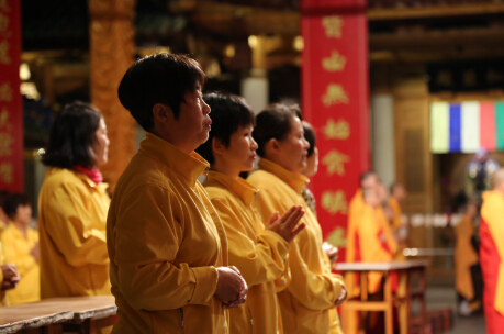 请灵仪式结束后,大众在维那圆满法师的带领下,回到大殿至诚礼祖。至早上6时左右,参与法会的诸大功德主、护法居士在照愿法师、法仪法师等引领下,于南普陀斋堂,同参加法会的诸位法师一起过堂用斋。 ![]()