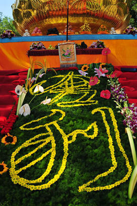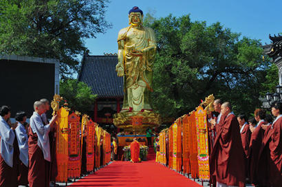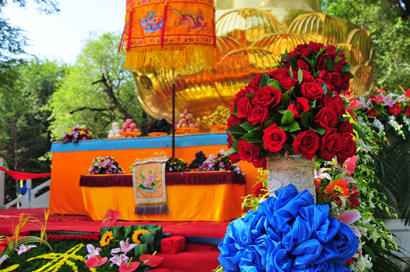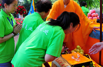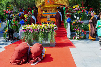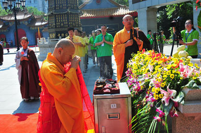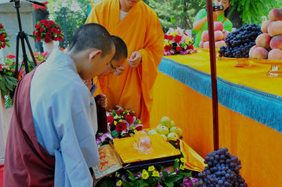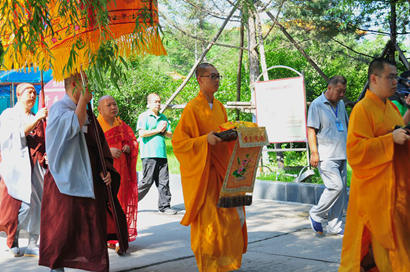 上午9时,极乐寺塔院,大击法鼓,梵声悠扬,诸戒子手持香、花、灯、幡,迎请舍利至布置一新的塔院露天阿弥陀佛下,供戒子瞻礼。