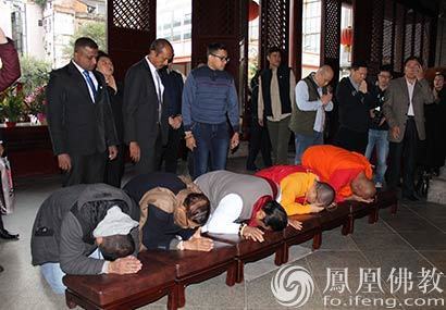 马欣达•拉贾帕克萨先生一行跟随耀智大和尚一起虔诚礼拜。(图片来源:凤凰佛教 摄影:如本法师)