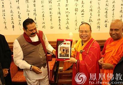 马欣达•拉贾帕克萨前总统把自己与习近平主席的合影相框回赠耀智大和尚。(图片来源:凤凰佛教 摄影:如本法师)