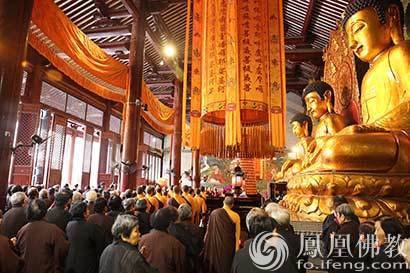 大雄宝殿,僧俗云集,巍巍金像放毫光,一派祥和气象。(图片来源:凤凰佛教 摄影:如本法师)
