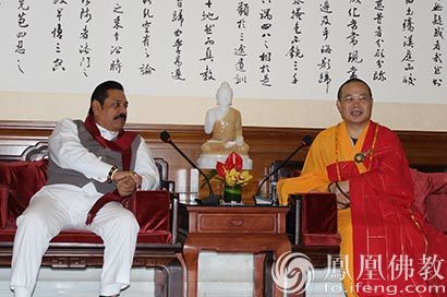 在方丈楼会客厅,耀智大和尚和马欣达•拉贾帕克萨先生亲切交谈。(图片来源:凤凰佛教 摄影:如本法师)