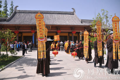 上午10点,大众云集大雄宝殿,班首带领大众和请法居士,打着各种庄严(幡、香炉、灯、伞盖)恭敬迎请方丈悟实法师上堂说法。悟实法师手拿如意,带领侍者拿着拄杖、拂尘、钵、具在观音殿等候。大众到后,与法师一通礼节,然后请法居士拈香设拜,迎请法师上堂说法。