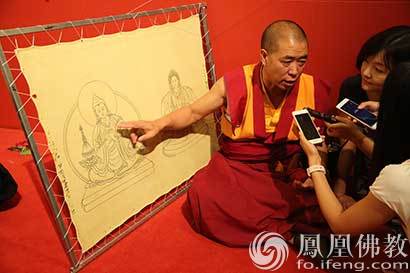 更登达吉现场演示绘制唐卡(图片来源:凤凰佛教 摄影:徐上杰)