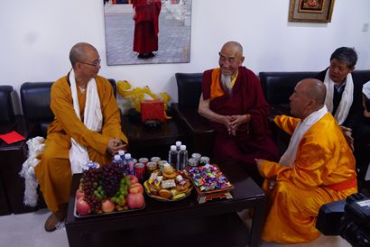 学诚会长与图布丹仁颇切亲切交谈(图片来源:中国佛教协会 摄影:陈星桥)
