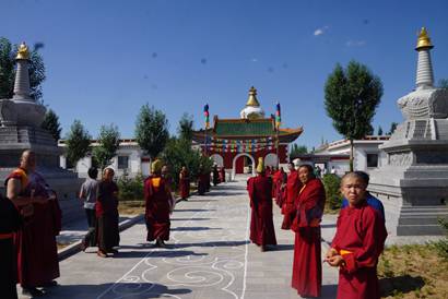 当日下午,调研组乘车赴巴彦淖尔市乌拉特后旗,调研东升寺情况,受到旗委书记巴图、旗长贾培新等领导和旗佛教协会那音太喇嘛、东升庙住持圆丹桑布的热情接待。东升寺是乌拉特后旗最大的寺院,始建于公元1750年(清乾隆十五年),鼎盛时期有喇嘛500多人,大小庙宇12座。现仅存一座大殿。目前正在规划重建。