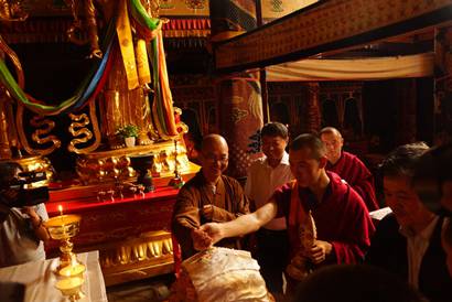 学诚会长与洞阔尔活佛一道佛前供曼扎(图片来源:中国佛教协会 摄影:陈星桥)