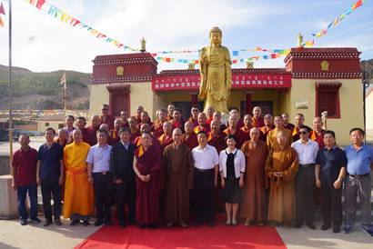 调研组与当地各级领导和喇嘛、法师在东升寺大雄宝殿前合影留念(图片来源:中国佛教协会 摄影:陈星桥)