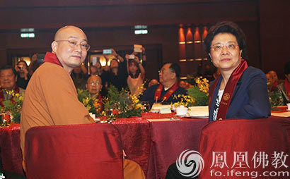 香港观宗寺方丈、香海正觉莲社社长宏明大和尚陪同中央政府驻香港特别行政区联络办副主任仇鸿女士观看晚宴开场表演(图片来源:凤凰佛教 摄影:李杰飞)