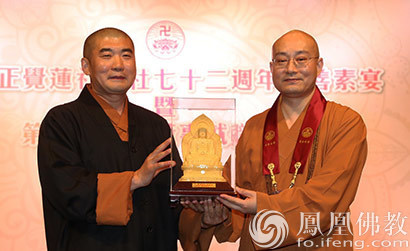 湛如大和尚代表中佛佛教协会向香海正觉莲社赠送礼物(图片来源:凤凰佛教 摄影:李杰飞)