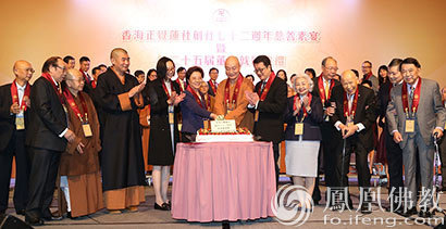 凤凰佛教通讯员罗孙可香港讯:2017年11月16日晚19时,香海正觉莲社假座香港会展中心1楼会议厅举行慈善素宴暨廿五届董事会就职典礼,以此欢庆创社七十二周年。中央政府驻香港特别行政区联络办副主任仇鸿女士、香港特别行政区民政事务局副局长陈积志先生、中国国家宗教事务局外事司司长肖虹女士、香港基本法委员会副主任梁爱诗太平绅士、中国佛教协会副会长湛如大和尚、香港孔教学院汤恩佳博士、香港道教联合会会长梁德华道长等领导大德、社会贤达、法师居士、护法善信等拨冗莅临出席晚宴,一同见证莲社新一届董事会成员庄严宣誓。