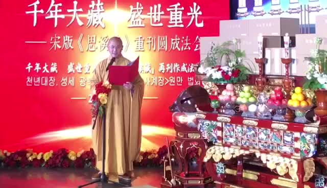 浙江省佛协会长、奉化雪窦寺方丈怡藏法师在致辞中表示:《思溪藏》之所以在两宋时期能够刊刻于湖州,有赖于湖州地区深厚的信仰需求及当年雄厚的经济实力。高僧辈出,丛林众多,这是湖州佛教界鲜明而光辉的特色。一千年前《思溪藏》的初刊,是湖州佛教历史的高峰。一千年后《思溪藏》的重刊,相信也会成为湖州乃至江浙地区佛教发展道路上新的里程碑。