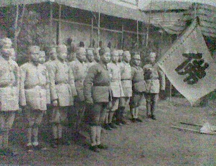 聂力中将在《山高水长回忆父亲聂荣臻》一书中写道:父亲回忆说:“……僧侣也是中国人,也痛恨日本鬼子,大法师然秀代表五台山僧众表示:“出家人慈悲为怀。吾等出家不出国,保不住国家,佛教、寺庙何存!抗日救亡,僧众有责!1938年春天,五台山青黄两庙僧众举行了声势浩大的抗日动员大会,并于同年4月16日正式成立“五台山佛教救国同盟会”。当时,台怀镇48座青庙、21座黄庙的各族僧众1700多参加了“佛救会”。之后,“佛救会”将两庙中18至35岁的480多名青年僧人迅速组织起来,成立“僧侣自卫队”,接受八路军组织的抗日培训。图为抗日战争时期,五台山成立了僧众抗日自卫队和尚连。(图片摄影:沙飞 拍摄于1938-1939年)