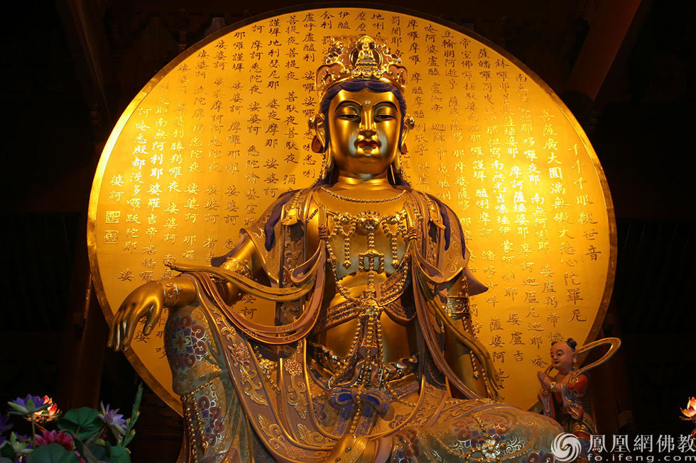 观音菩萨大家都知道,在亚洲大乘佛教信仰圈中,观音是最为著名的菩萨。观音菩萨救苦救难,慈悲即观音,在中国妇孺皆知,深入人心。可以说已成为中国人超越时空的心灵依靠,无论你在哪里,你总能看到对观世音菩萨发自内心的虔敬信仰。今天是2017年3月16日,农历二月十九,恭逢观世音菩萨圣诞,小编特别搜集全球观音圣像,让我们一起礼赞大悲观世音的无量功德,祈愿观世音菩萨慈悲护佑,一切众生,永离苦痛,长得安乐。图为浙江普陀山大乘禅院水月观音像,衣饰华丽、身姿优美,在观音菩萨造像中首屈一指的精品。又被称为东方的蒙娜丽莎或东方维纳斯。(图片来源:凤凰佛教 摄影:李保华)