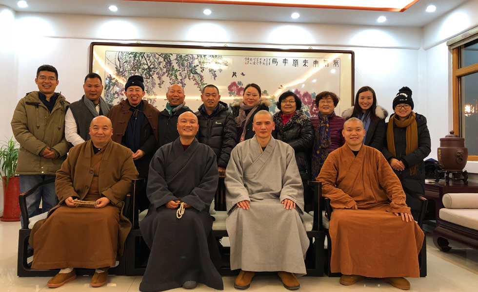 2018年1月29日,《鸠摩罗什》电视大型纪录片剧组和总指导道空法师以及明心法师与黄龙宗祖庭江西省修水县黄龙禅寺住持心廉法师等一众居士,参访河北省隆福寺慧廣大和尚。(图片来源:凤凰网佛教 摄影:江西黄龙禅寺)