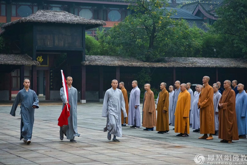 2019年是中华人民共和国成立70周年,中国佛教界以各种形式庆祝中华人民共和国成立70周年。2019年10月1日,峨眉山大佛禅院全体僧众及员工在大佛禅院国学馆门前举行了升国旗仪式。(图片来源:凤凰网佛教 摄影:大佛禅院)