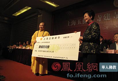 庆典大会上,上海玉佛禅寺向上海慈善基金会捐款100万元,定向用于援建云南贫困山区引水工程。(图片来源:凤凰网华人佛教 摄影:印媛)