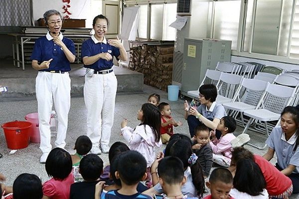 慈济志工在花莲县秀林乡水源村原住民部落推动资源回收一年多,10月4日特地举办感恩茶会,感恩平常在小区做回收的村民,并接引乡亲对慈济有更深入的了解。志工设计闯关游戏让小朋友学习环保观念;志工带动小朋友比手语。 日期:2014/10/04 地点:台湾花莲县秀林乡水源村活动中心 摄影者:刘鸿荣