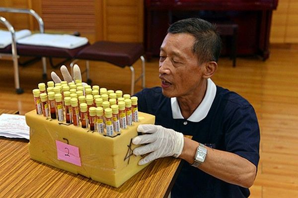 10月11日,慈济志工于埔里联络处举办骨髓捐赠捐髓验血活动,民众纷纷前来响应加入救人行列。包装区志工详细核算血液样本。 日期:2014/10/11 地点:台湾南投县埔里镇埔里联络处 摄影者:潘常光